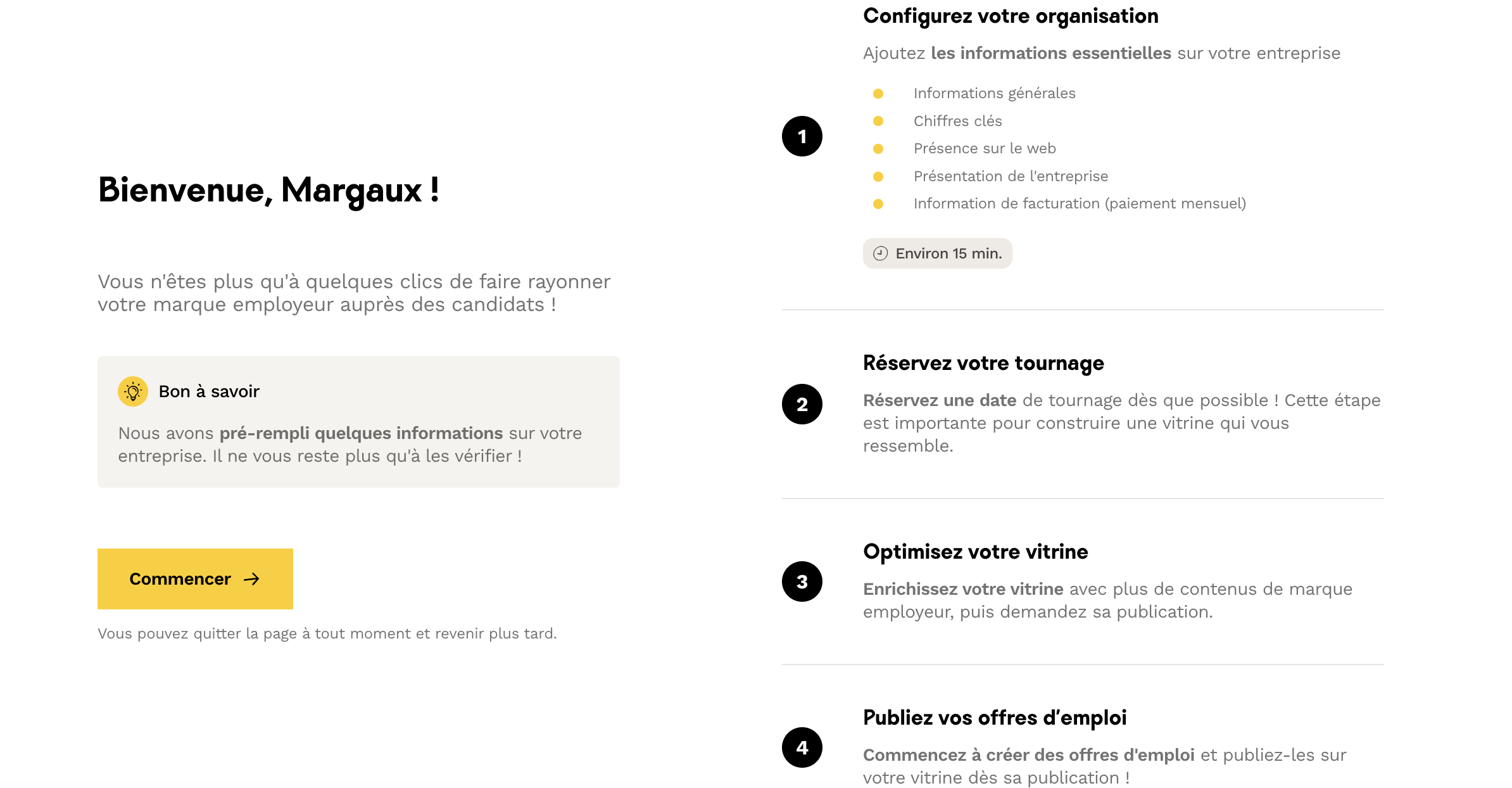Si vous êtes accompagné par une agence RH, nous vous recommandons de créer un accès à votre contact pour qu'il puisse vous accompagner dans la phase de création de votre vitrine, et accompagnement lors du tournage.