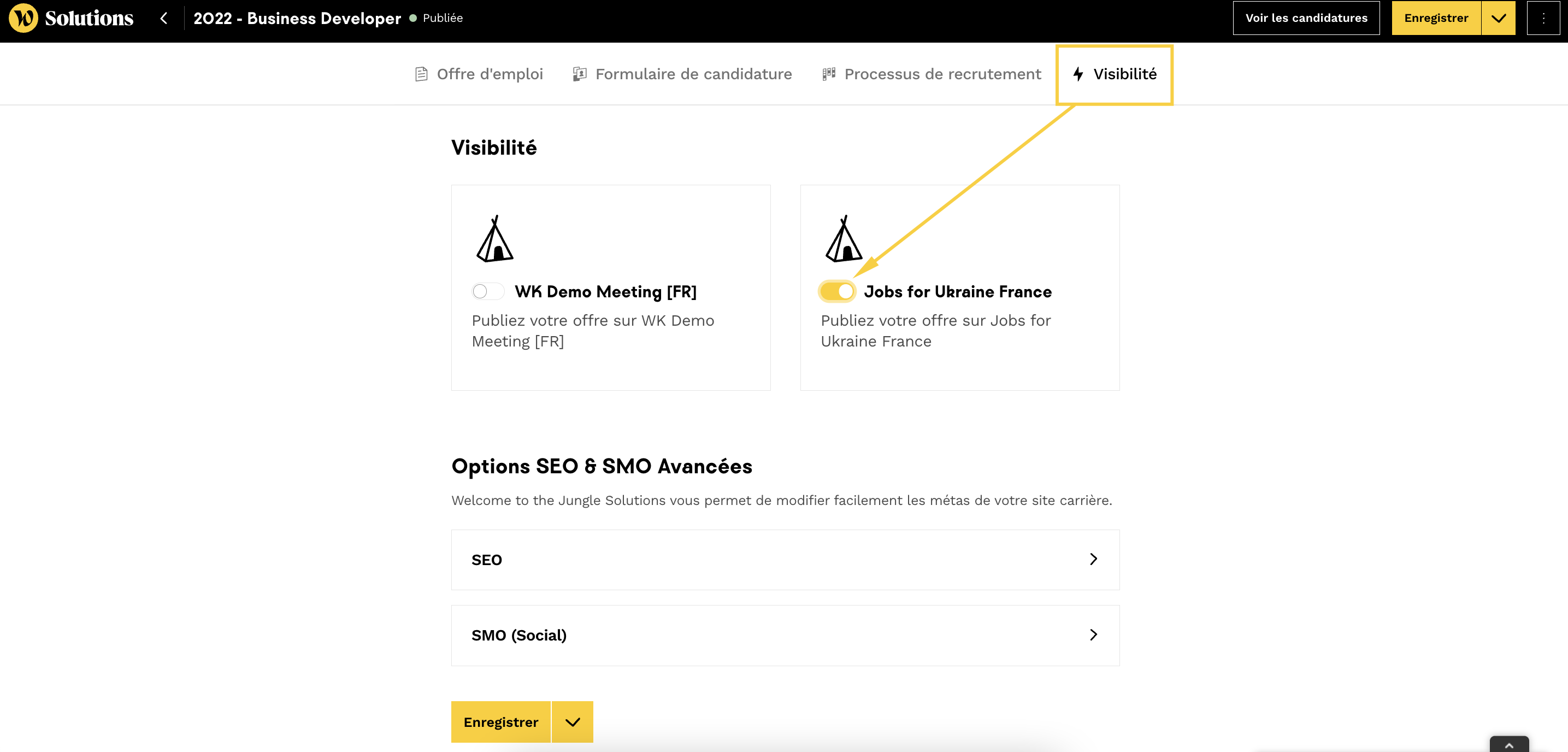 Sélectionnez la diffusion sur le job board “Jobs for Ukraine” à l’étape Visibilité.