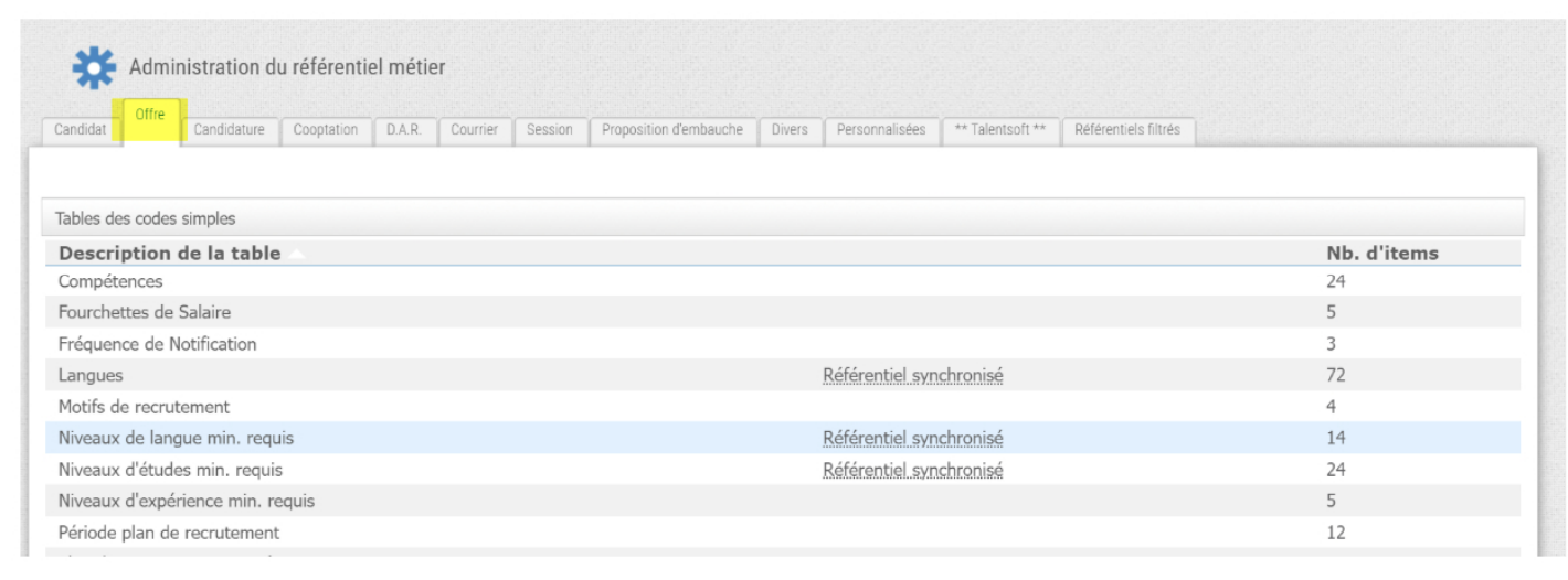 - Recrutement > Administration > Référentiel > Référentiel métier > Onglet "offre"