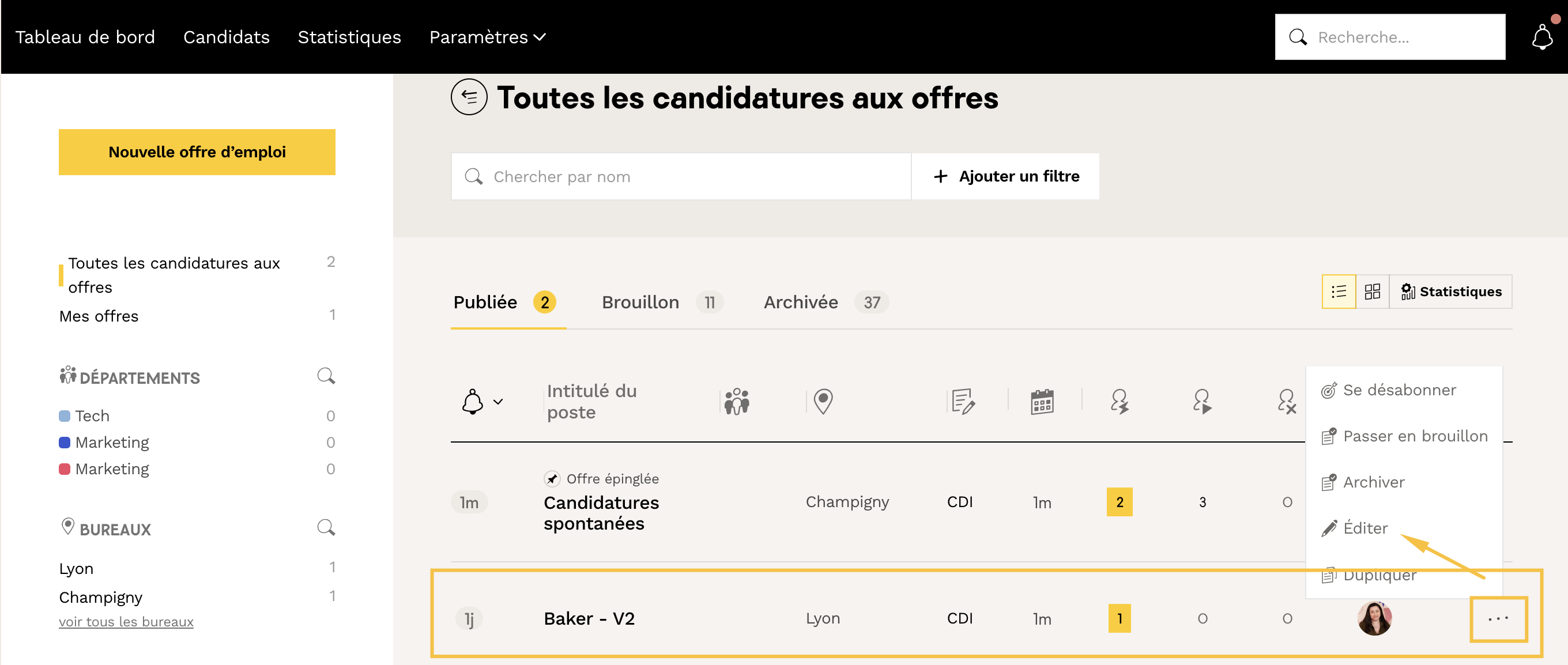 - Cliquez sur le bouton "Éditer" disponible à droite de l'offre depuis le tableau de bord de l'ATS