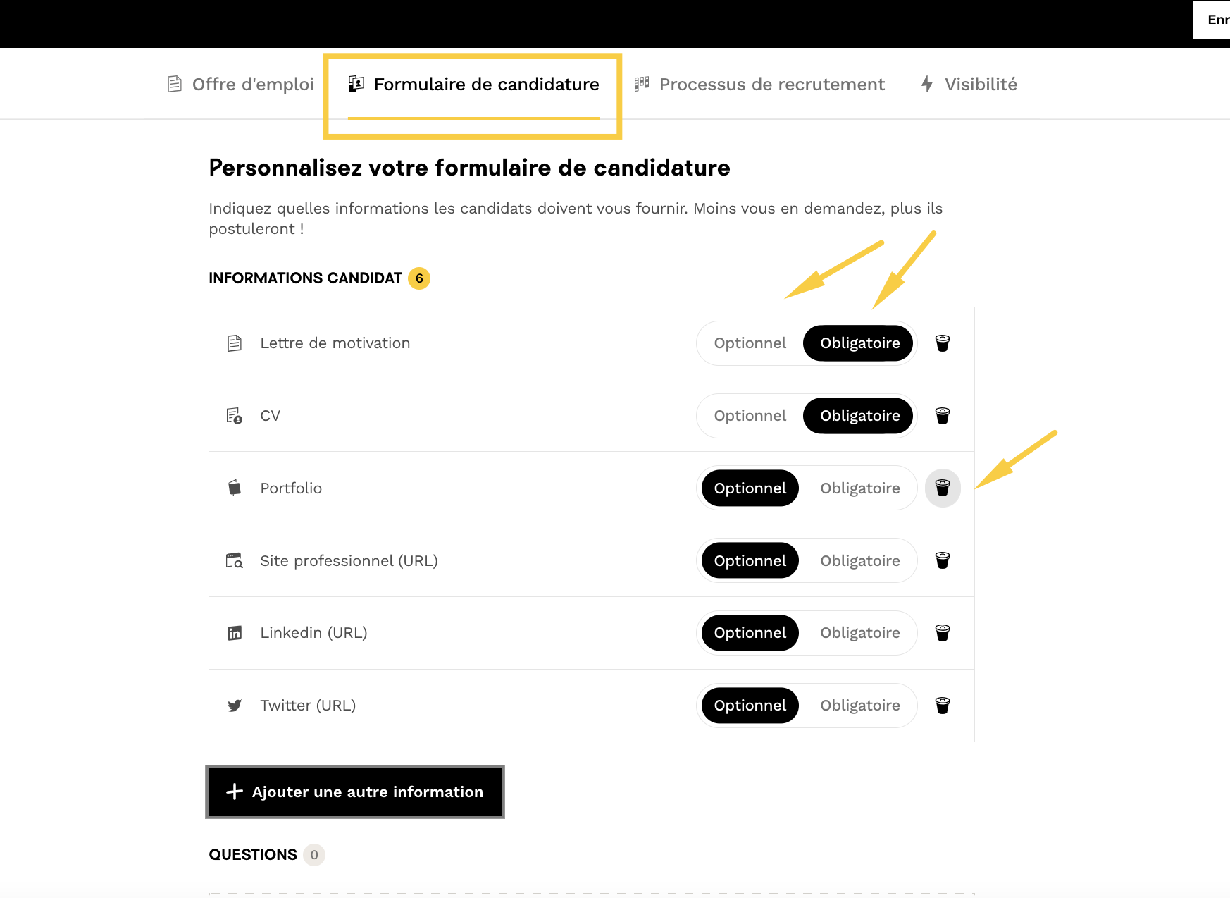 Dans la section "Formulaire de candidature", vous pouvez moduler les attentes selon le type de poste :