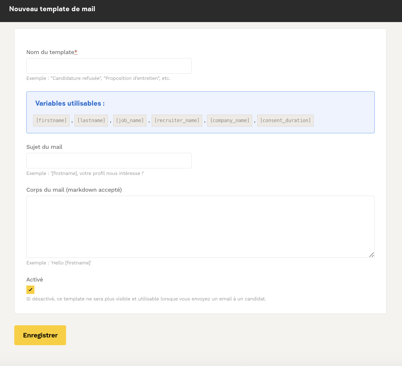 Utilisez les variables disponibles pour personnaliser automatiquement vos emails (nom du candidat, poste, entreprise, etc.).