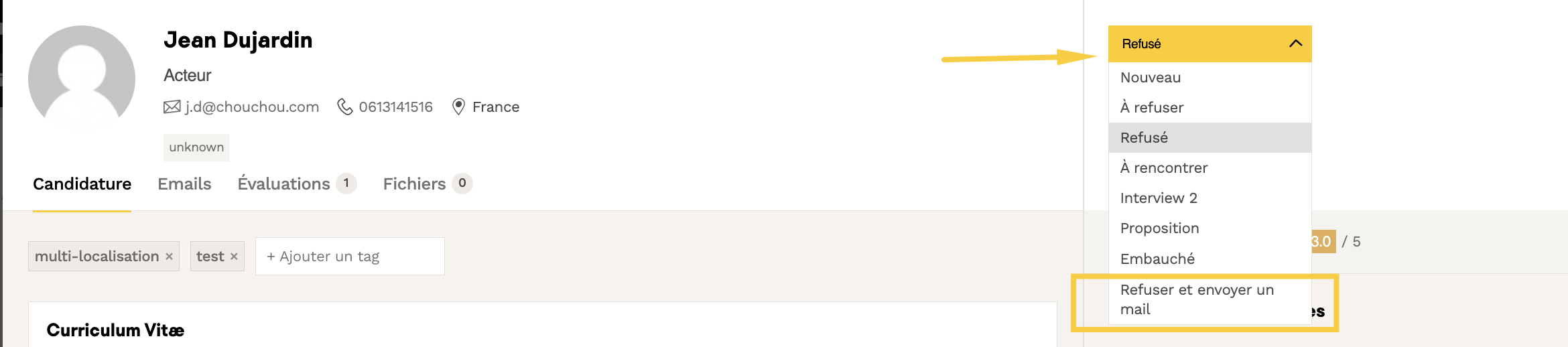 - Template "Mail de refus par défaut" : utilisé avec le bouton "Refuser et envoyer un e-mail" disponible sur chaque fiche candidat