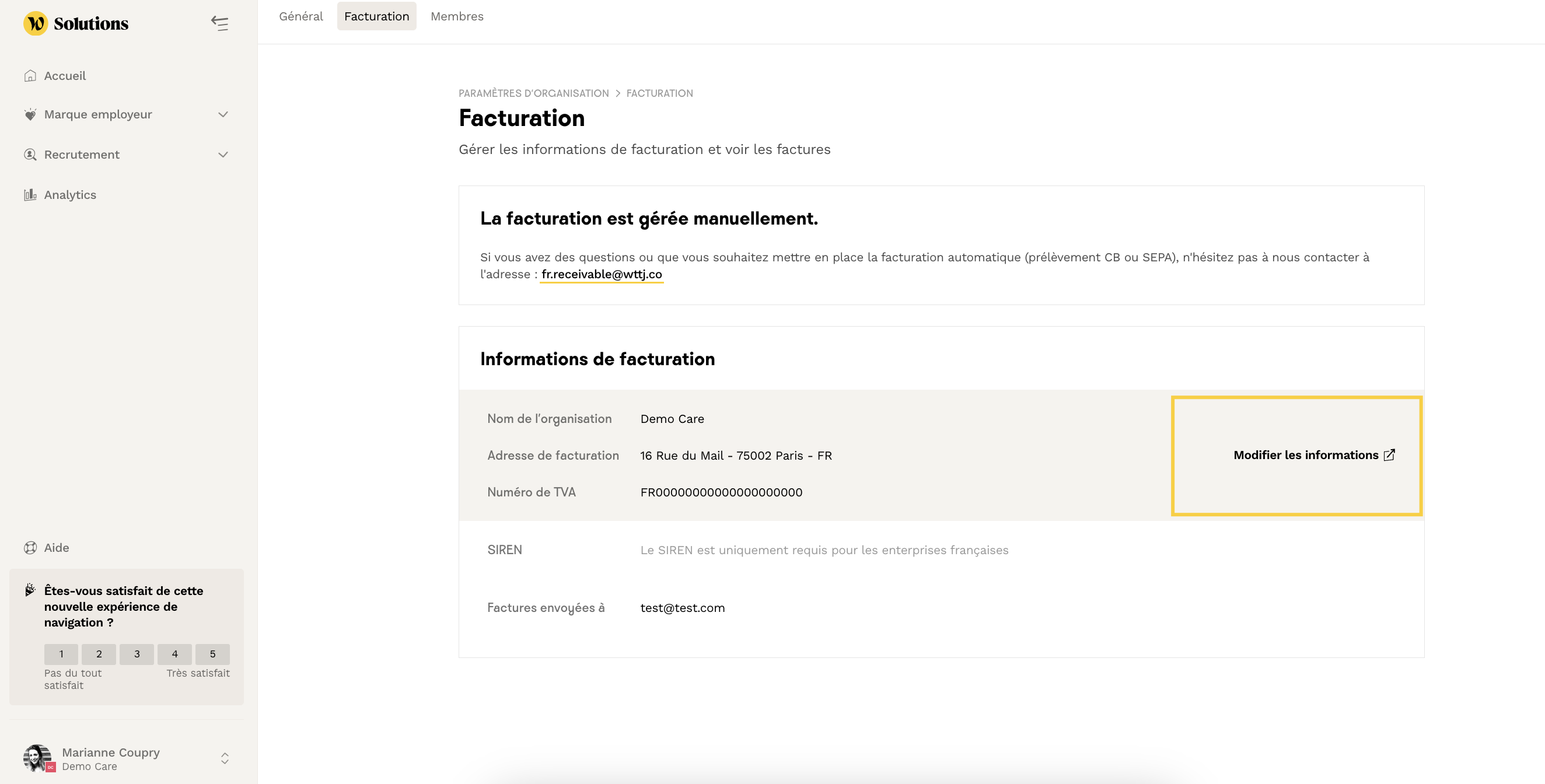 💡 Cet article vous guide dans la gestion complète de vos informations de facturation et de paiement pour votre abonnement Welcome to the Jungle Solutions. Vous découvrirez comment paramétrer votre prélèvement mensuel et mettre à jour vos informations de facturation.