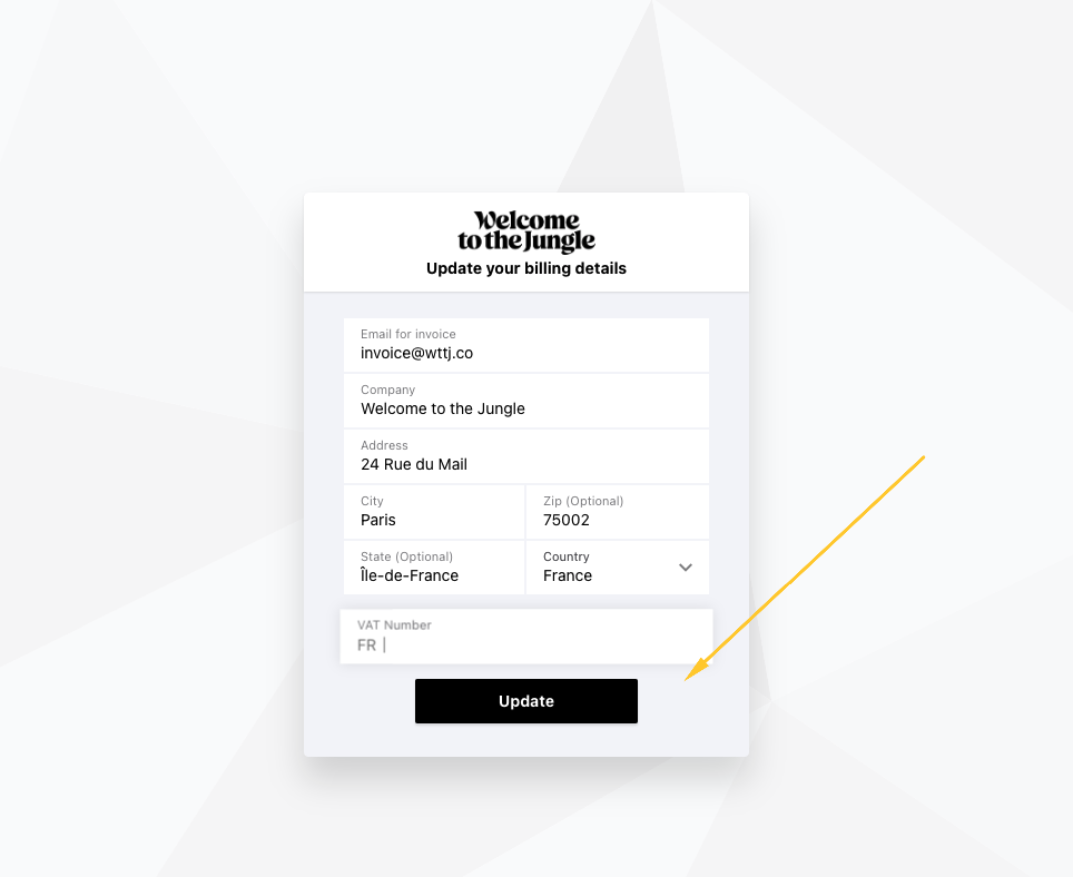⚠️ Si vous n'êtes pas assujetti à la TVA et que vous ne parvenez pas à mettre à jour vos informations, contactez notre service Finance : fr.receivable@wttj.co