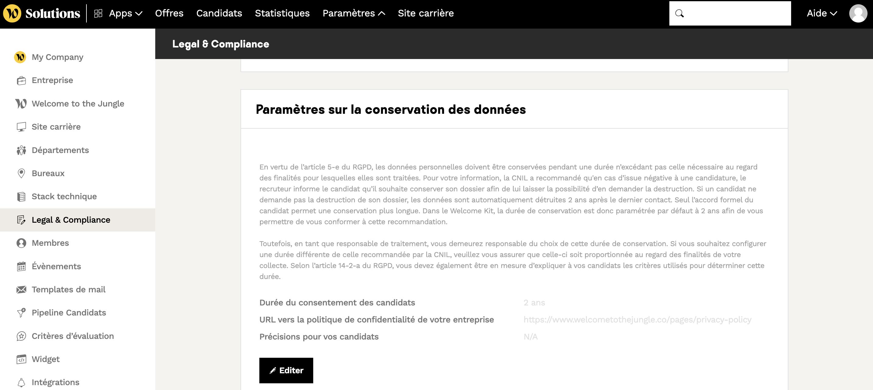 Dans l'ATS Welcome to the Jungle Solutions > Paramètres > Legal & Compliance > Paramètres sur la conservation des données, vous pouvez configurer :