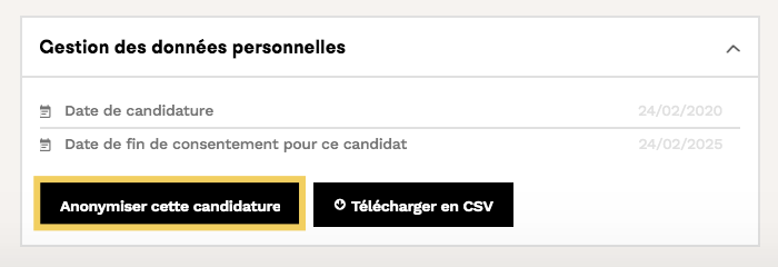 Chaque fiche candidat dispose d'un bouton d'anonymisation dans la section "Gestion des données personnelles" :