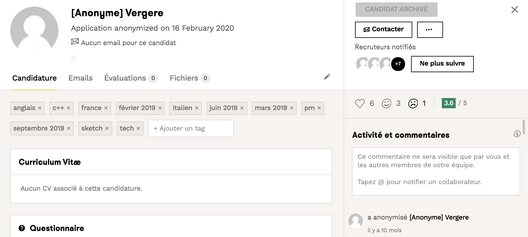 Le système procède automatiquement à l'anonymisation à la fin de la période de consentement. Les candidatures sont alors archivées et prennent un nom de personnage fictif :