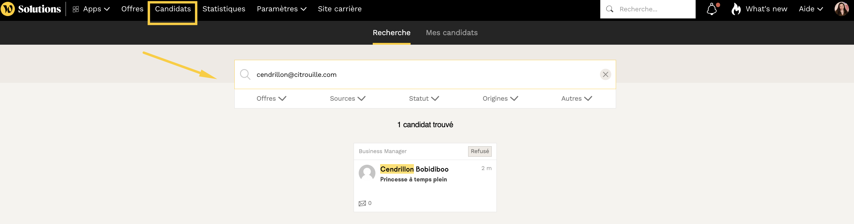 - Collez-la dans la barre de recherche de l'onglet "Candidats" Dans l'ATS