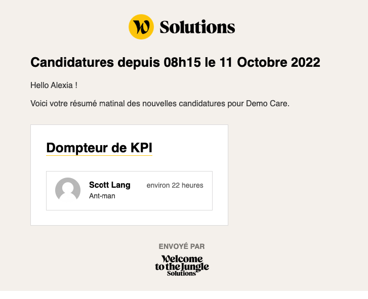Chaque matin un email est envoyé par l'adresse contact@welcomekit.co à tous les administrateurs de l'ATS ainsi qu'aux membres assignés aux offres en tant que recruteurs. Ce recap récapitule l'activité qui s'est passée sur les offres que vous suivez sur Welcome to the Jungle Solutions ATS (nouvelle candidature, mail, refus).