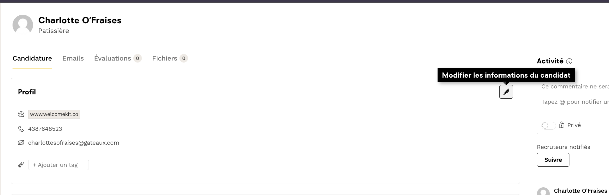 Toutes les fiches candidats, qu'elles aient été ajoutées manuellement par l'équipe de recrutement ou réceptionné directement depuis vos offres WttJ peuvent être modifiés !