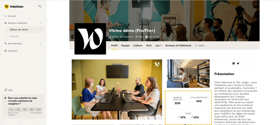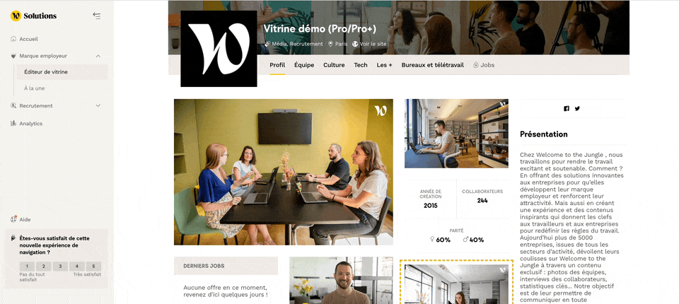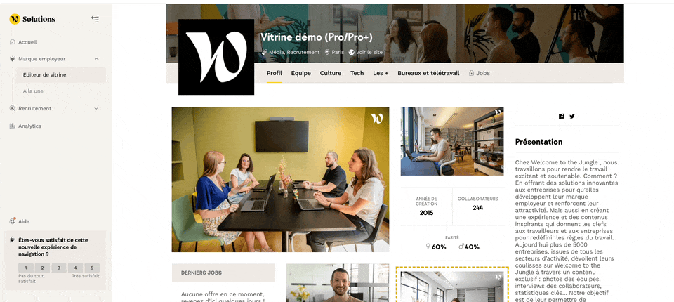 La fonctionnalitĂ© Ăditeur de vitrine se trouve dans la partie "Marque Employeur" de la plateforme Welcome to the Jungle Solutions.