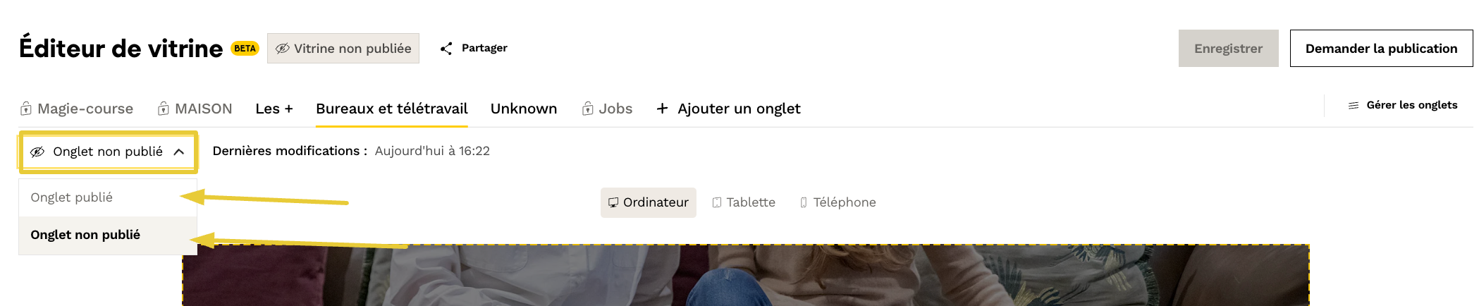 - Vous pouvez laisser un onglet en "non publié" le temps de le compléter