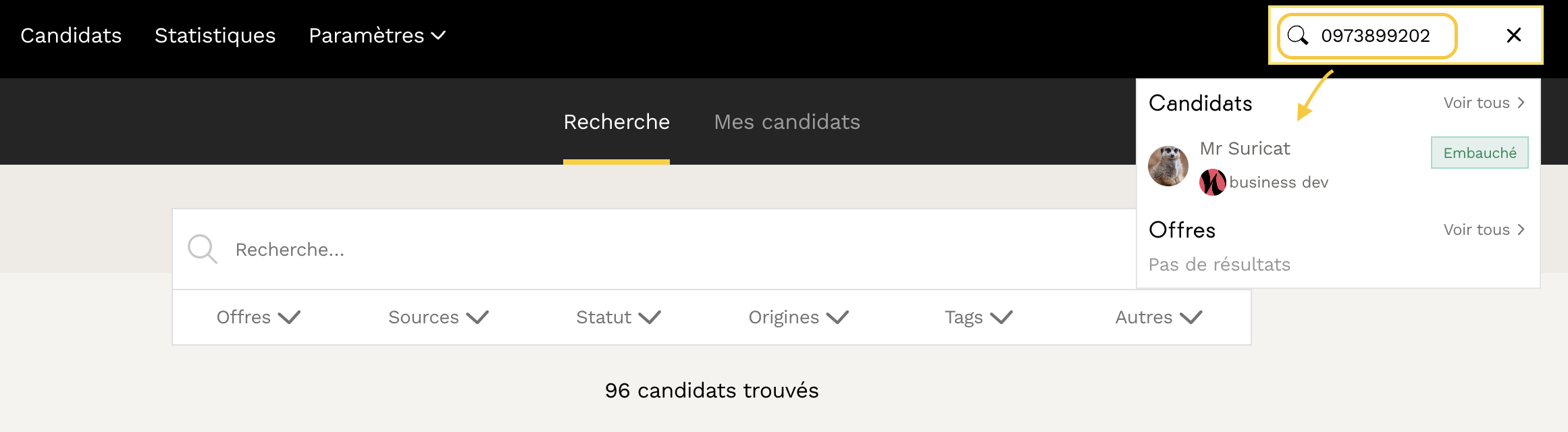 Rendez-vous dans l'onglet principal Candidats dans l'ATS. Vous y retrouverez :- Les candidatures qui ont retenu votre attention