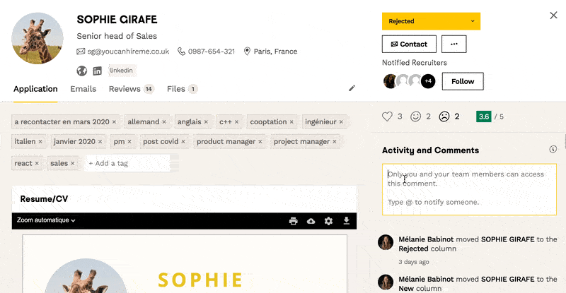 - Utilisez l'espace commentaires pour faciliter les échanges entre recruteurs