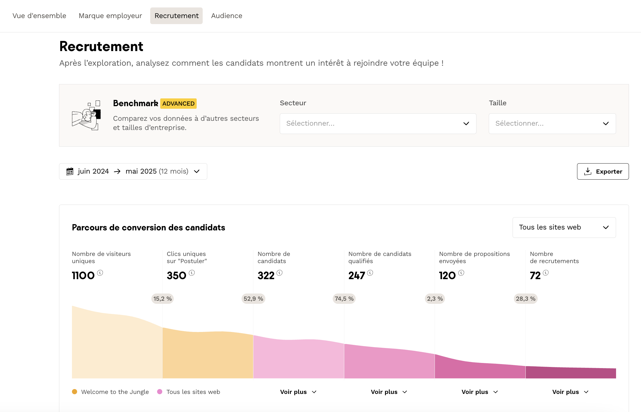 Une fois l’offre archivée, vous pourrez consulter le parcours de conversion des candidats directement dans l’onglet « Recrutement » d’Analytics. Plus d'informations sur cet article.