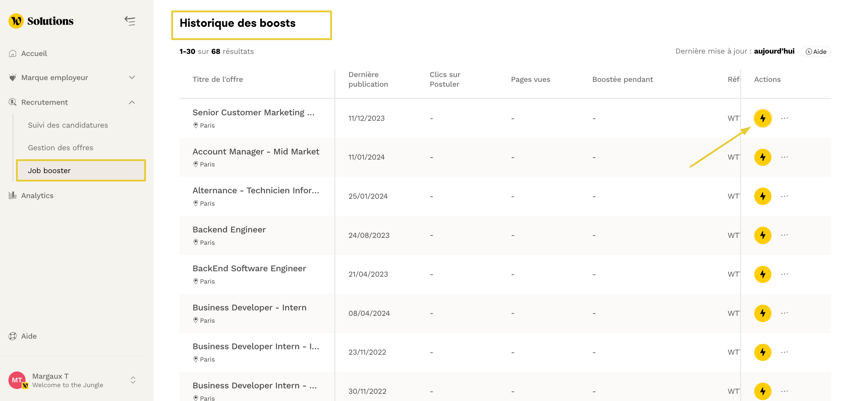 - Rendez-vous dans la section "Recrutement" puis "Job booster" sur la plateforme WttJ Solutions