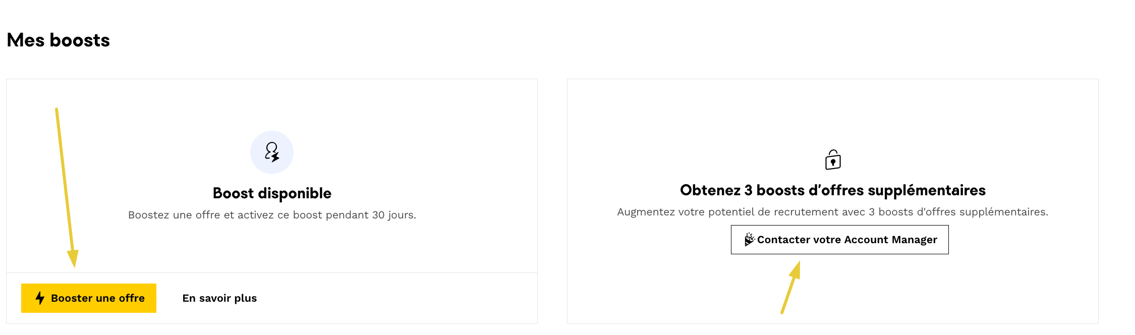 - Comment obtenir des boosts supplémentaires ? Cliquez sur "contacter votre Account Manager" depuis l'onglet Job booster pour échanger sur cette possibilité.