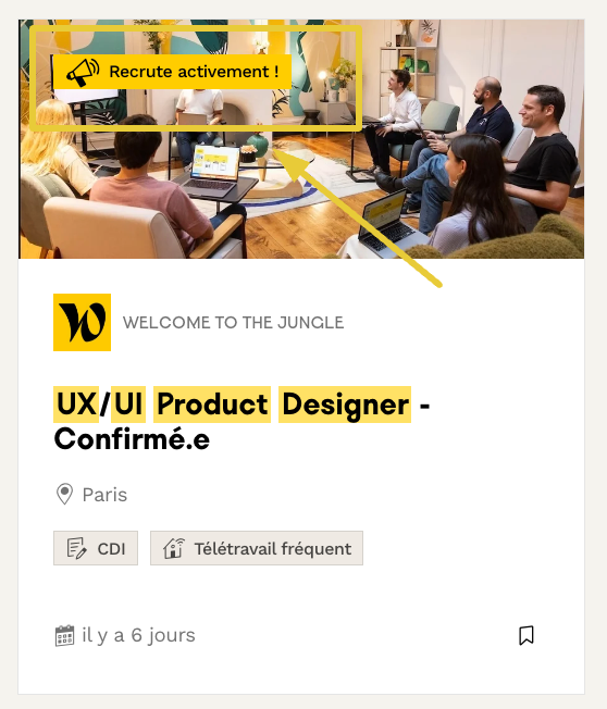 Lorsqu'un candidat effectue une recherche avec des mots-clés correspondant à votre offre sponsorisée, celle-ci apparaîtra en haut de la page des résultats avec des éléments visuels distinctifs comme la mention "Recrute activement":