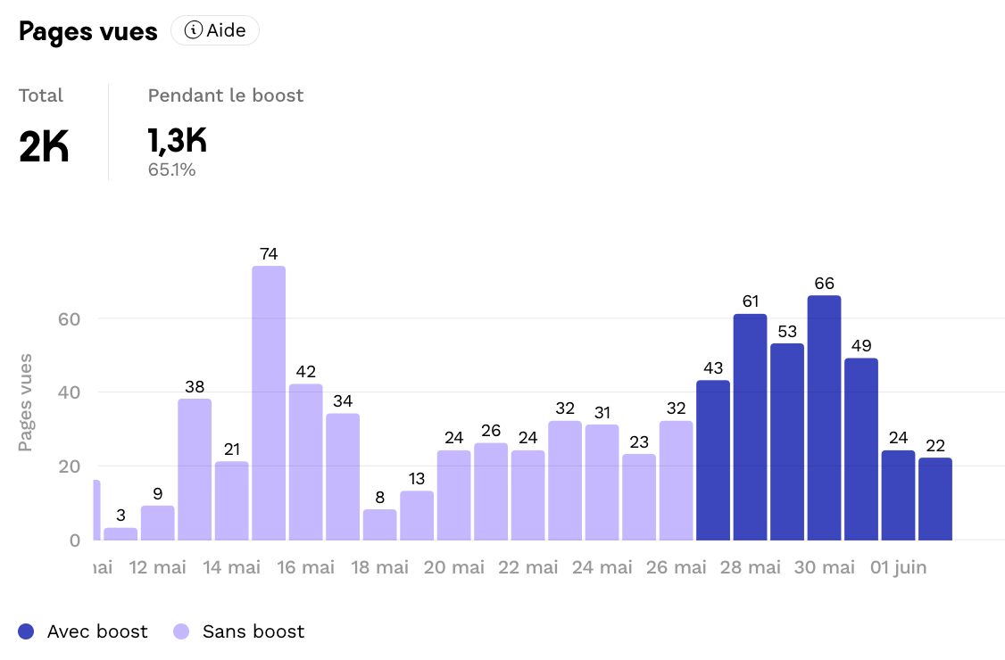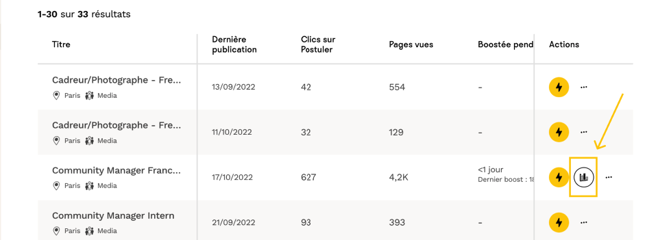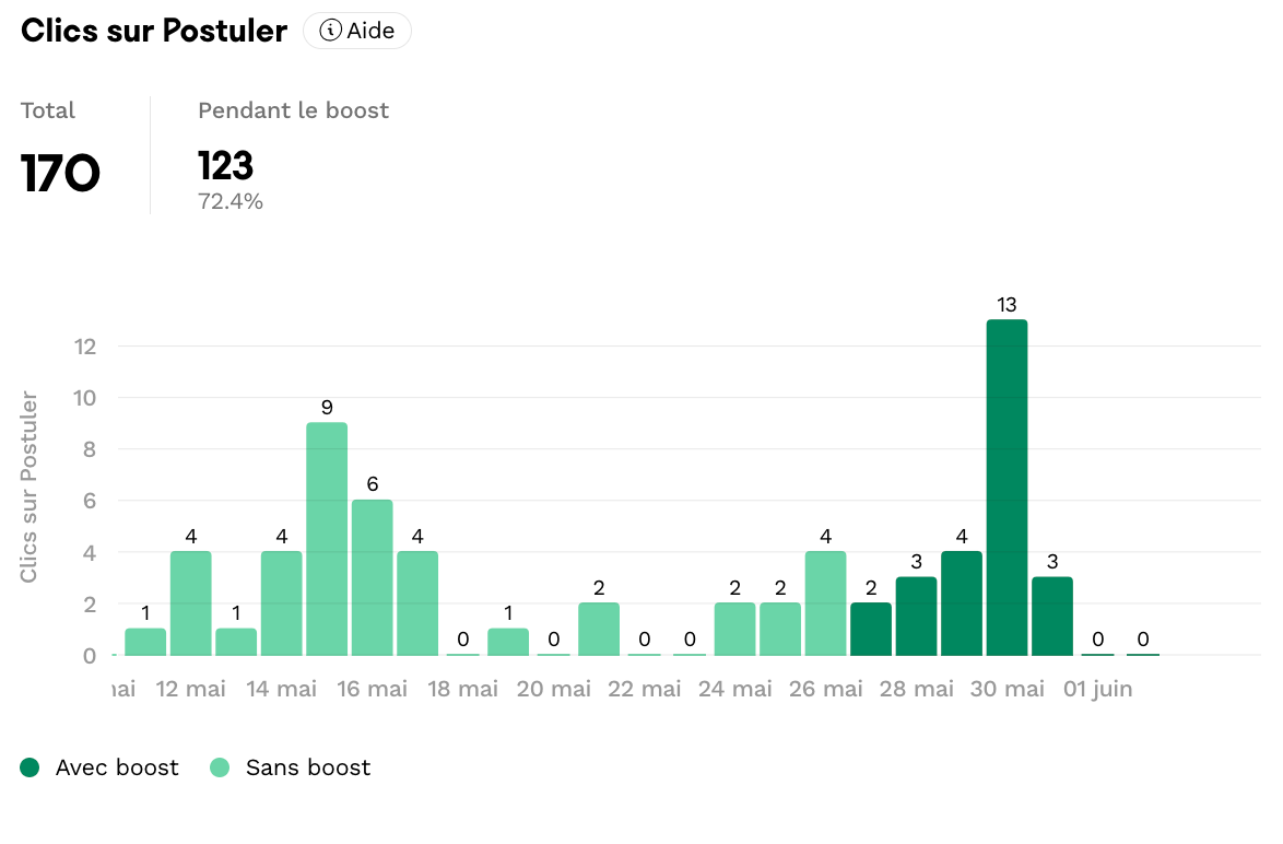 ⚠️ Les statistiques liées aux boosts restent accessibles jusqu’à douze mois après la date d’expiration du boost, que l'offre soit toujours en ligne ou archivée.