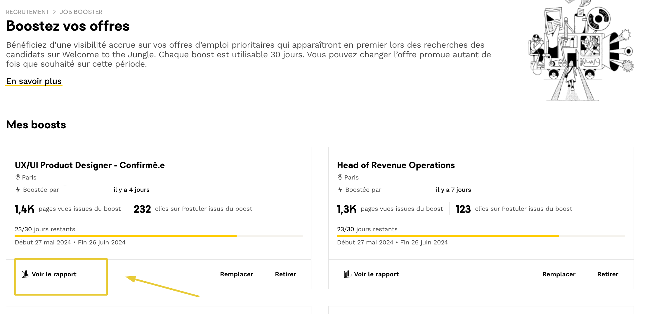 - Historique : cliquez sur "Rapport" à droite des offres précédemment boostées