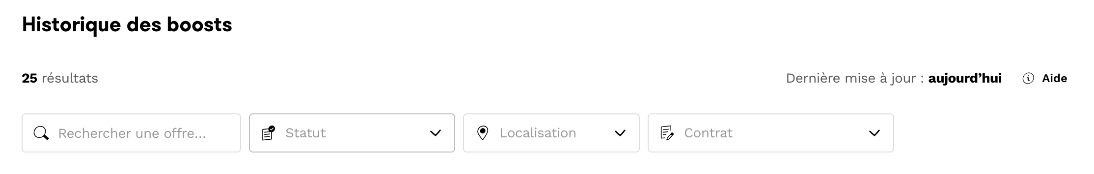 De plus, vous pouvez filtrer l'historique de vos boost par statut de l'offre d'emploi, localisation ou type de contrat :