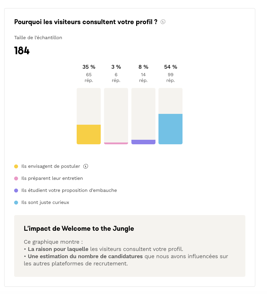 Au-delà des raisons de visite, cette enquête vous donne également un pourcentage estimé de candidats influencés par votre page qui ont ensuite postulé via un autre canal (ex : site carrière, cooptation, etc.).