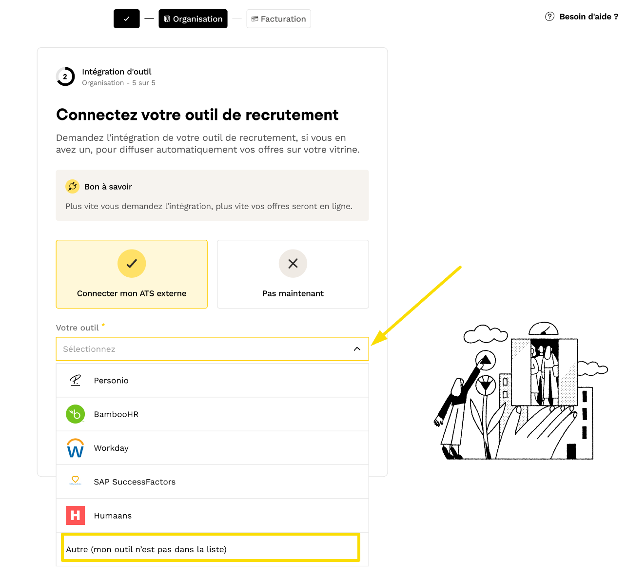 Votre ATS ne se trouve pas dans la liste ? Pas d'inquiétude, vous pouvez cliquer sur l'otion : "Autre (mon outil n'est pas dans la liste)", un Typeform va s'ouvrir sur la droite de votre écran vous invitant à compléter les informations de votre ATS.
