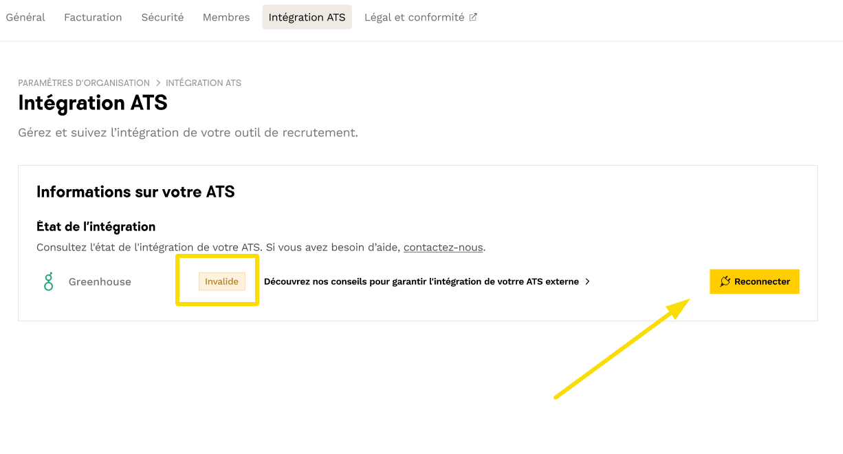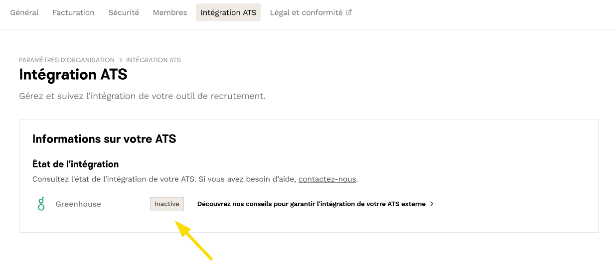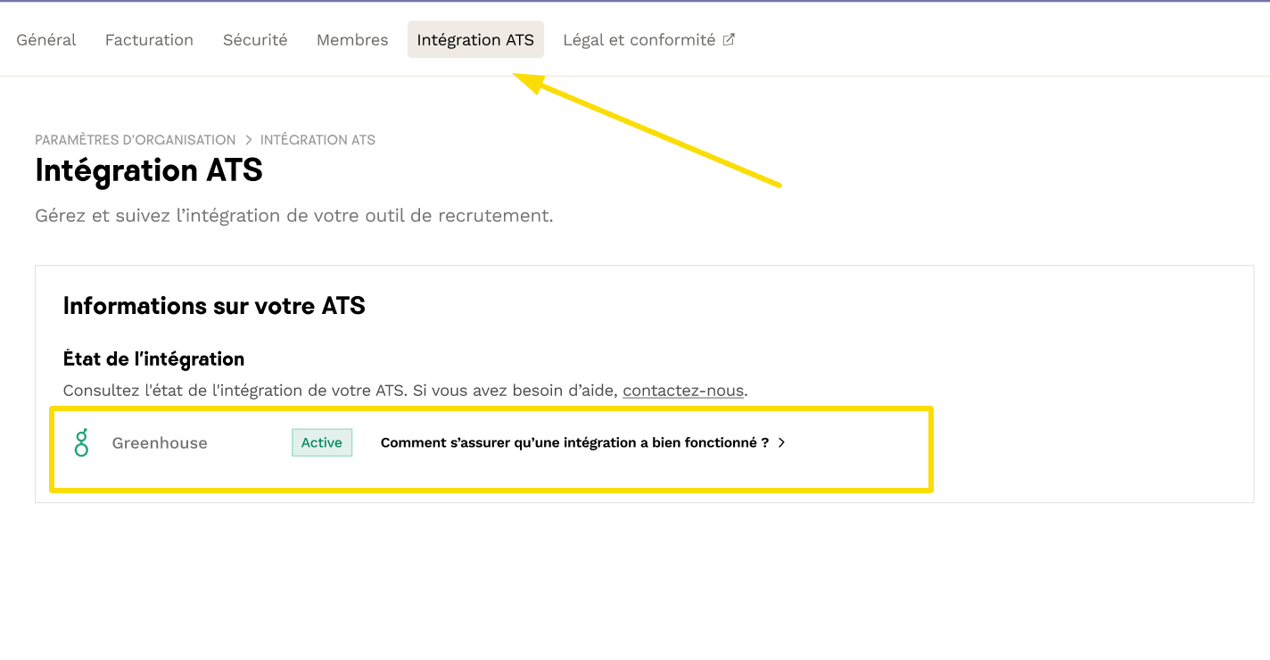 Vous aurez la possibilité de suivre l'état de votre intégration depuis les "paramètres de votre organisation" dans l'onglet "Intégration ATS" :