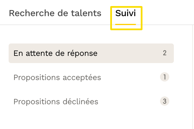 Tous les talents que vous aurez contactés seront disponibles depuis l’espace sourcing dans votre section « suivi » de l'emploi concernée. Cela vous permettra de suivre facilement les retours.