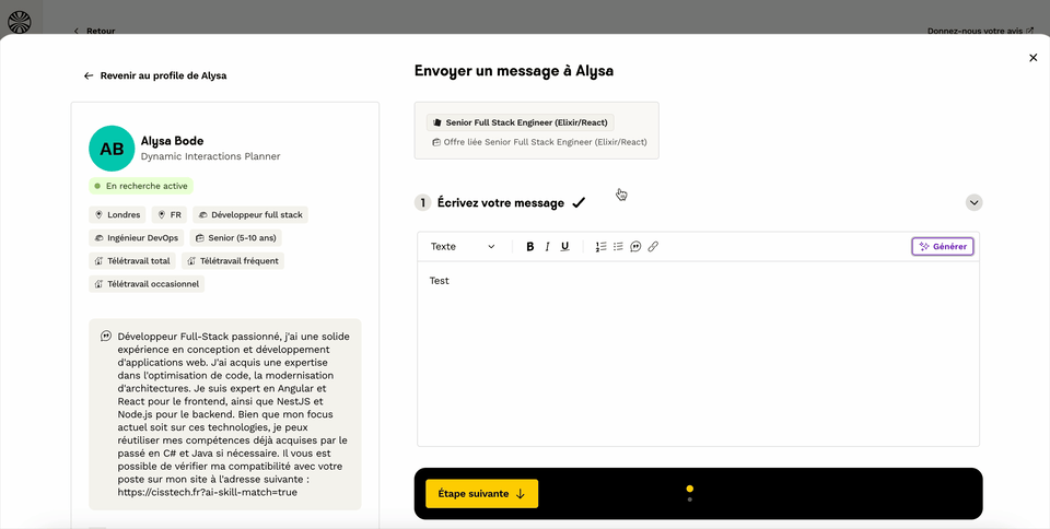 En utilisant le bouton "Générer", notre IA créera un message personnalisé qui intègre les éléments du profil du talent et de votre offre, que vous pourrez ensuite adapter à vos besoins.
