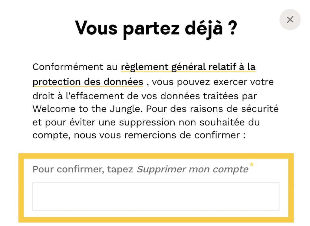 - Pour confirmer votre choix et éviter toute suppression accidentelle, tapez la phrase exacte "Supprimer mon compte"