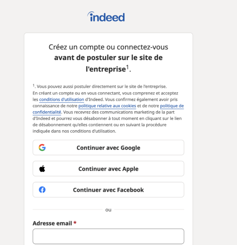 Le parcours d’un candidat qui découvre votre offre sur Indeed est très simple. En cliquant sur le bouton postuler, ce dernier va obligatoirement être amené à se connecter à Indeed, pour pouvoir effectivement parvenir au formulaire de candidature de l’offre. (Depuis 2022 les candidats doivent obligatoirement être connectés à Indeed pour pouvoir postuler aux offres).