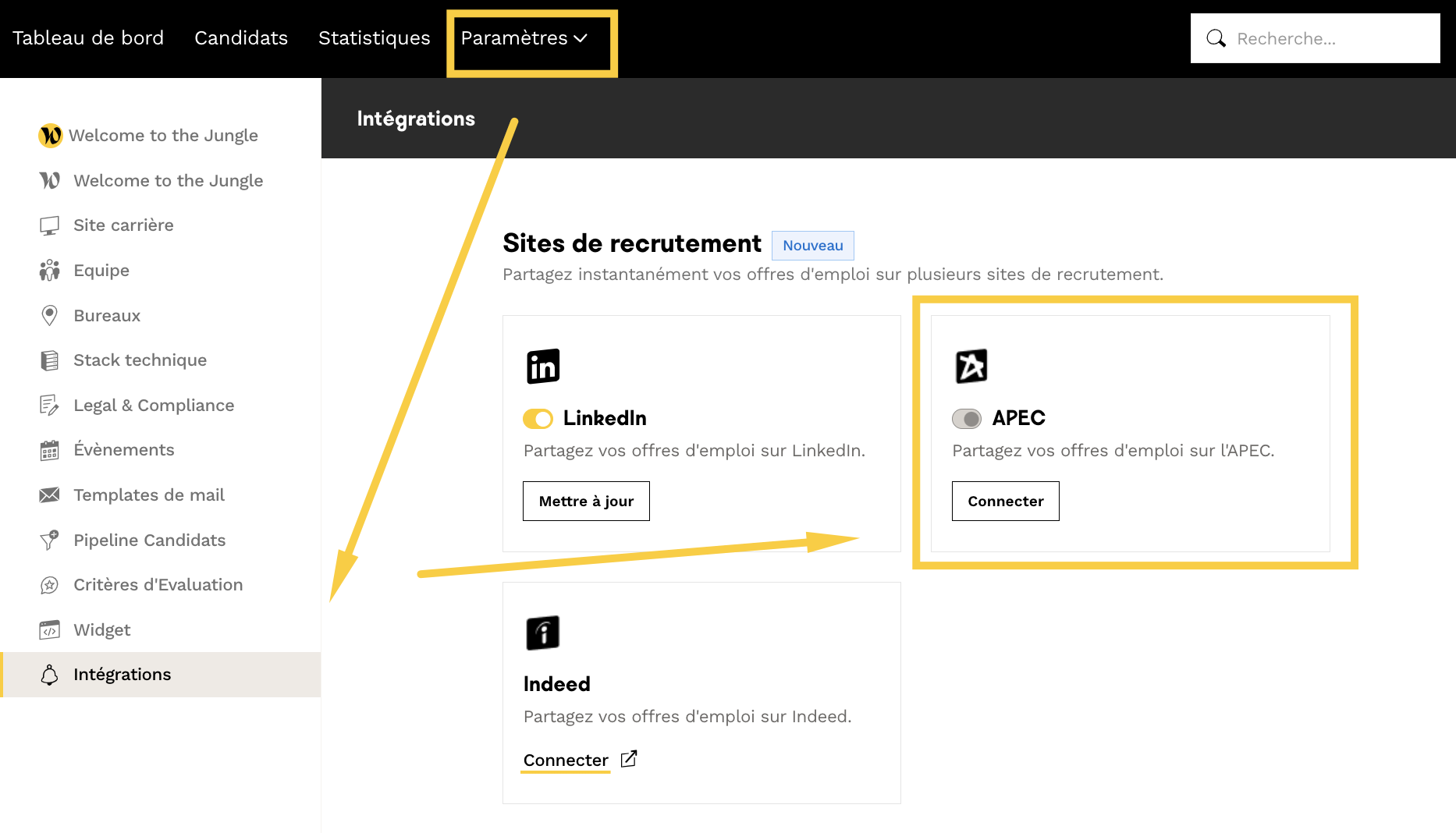 Une fois que vous aurez cette information, rendez-vous dans les paramètres de l’ATS, sélectionnez l’onglet “Intégrations”.