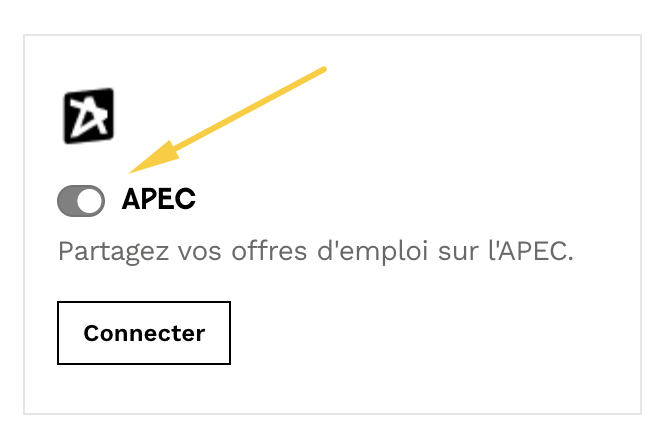 Vous pouvez vérifier si la connexion est bien établie directement depuis le formulaire de création de vos offres d’emploi dans l’onglet “Diffusion”. Si la connexion est active, l’encart APEC sera coché en jaune, sinon elle sera en blanc :
