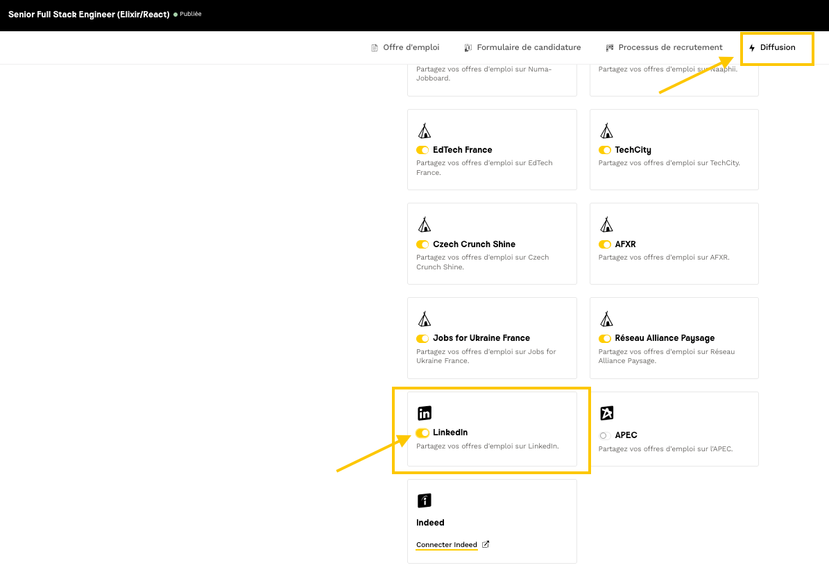 ⚠️ Une fois l’intégration en place, vous pouvez sélectionner les offres que vous souhaitez diffuser sur LinkedIn en retournant dans les paramètres de chacune de vos offres, dans l'onglet "Diffusion".