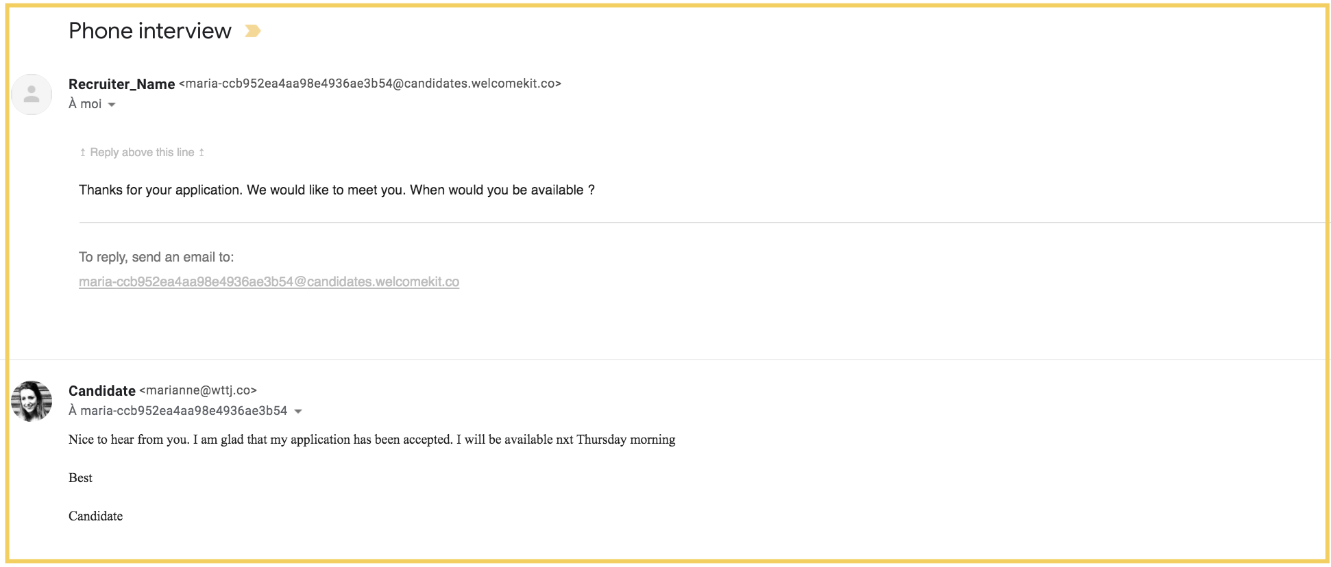 Lorsqu'un candidat vous répond, vous recevez une notification par email et l'échange est transcrit directement dans votre boîte mail. (Voir la capture d'écran ci-dessous)