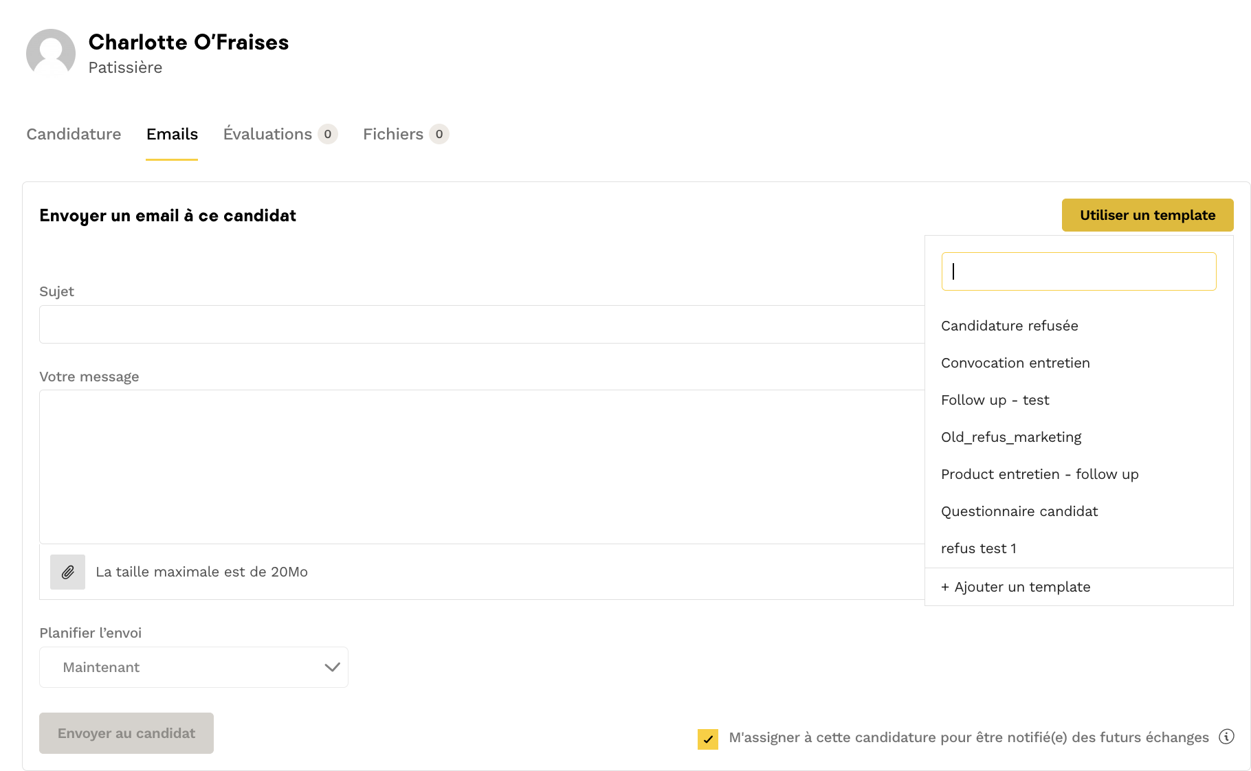 Le fait d'envoyer un mail à un candidat assigne automatiquement le candidat au recruteur en question. Dès qu'il envoie un mail, est cochée par défaut la case : "M'assigner à cette candidature pour être notifié(e) des futurs échanges". Il est tout à fait possible de la décocher, afin de ne plus recevoir de notifications sur les échanges futurs du candidat avec n'importe quel recruteur.