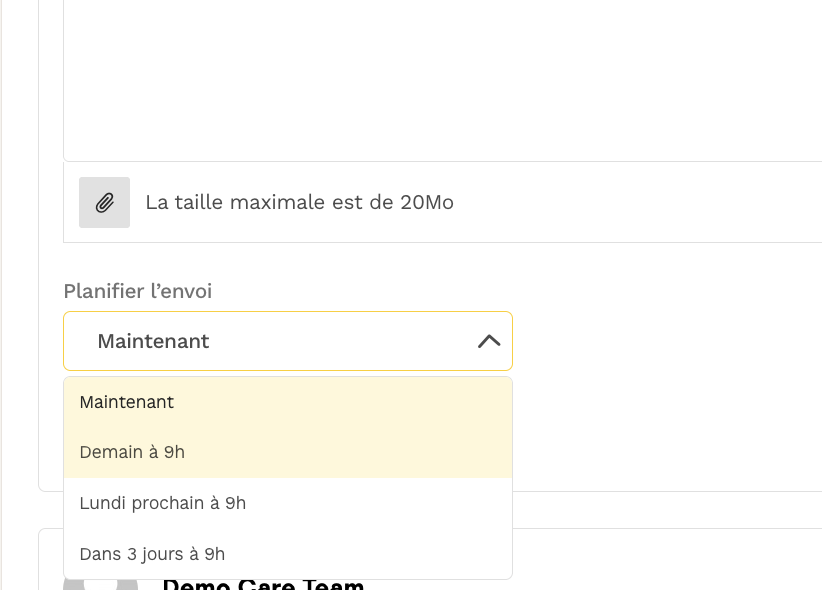 Vous pouvez également différer l'envoi de l'email en sélectionnant l'encart "Planifier l'envoi " :