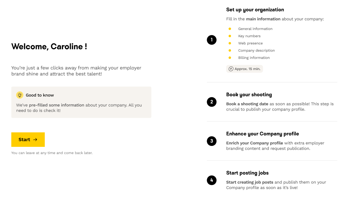 You are now on this page as your company's first contact. Here, you can tell us a bit more about your company. Don't worry, you can leave the page at any time and come back later.