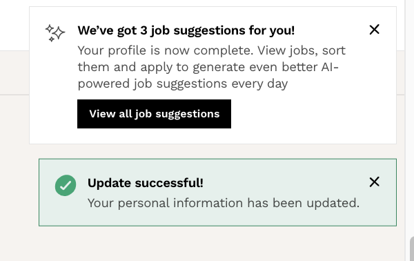 💡If you have no suggestions after completing your profile, don't worry! New suggestions will be offered as opportunities open up on our site. At the same time, don't hesitate to modify your profile information by detailing your experience and being more specific about the job you're looking for.