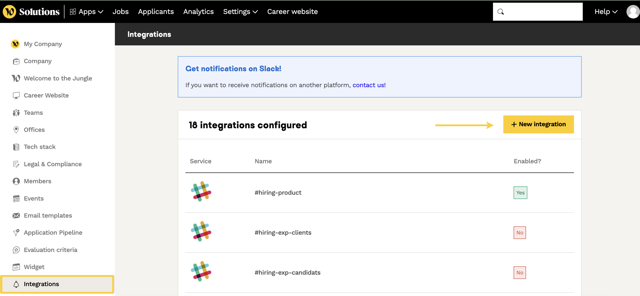 If you want to be informed in real time of all applications and events, you can set up a Slack integration by clicking your company logo at the top left: Organisation Settings > Integration
