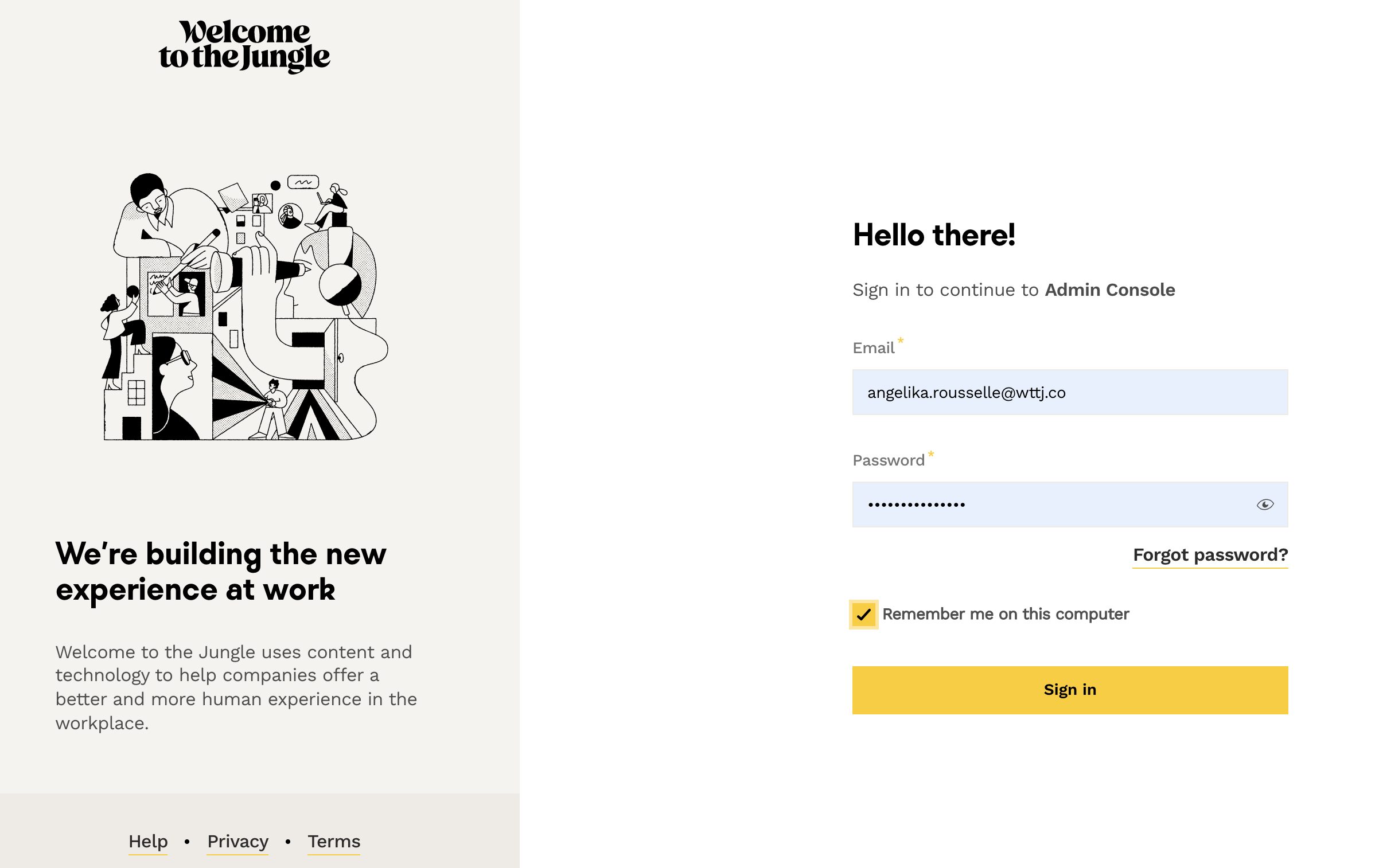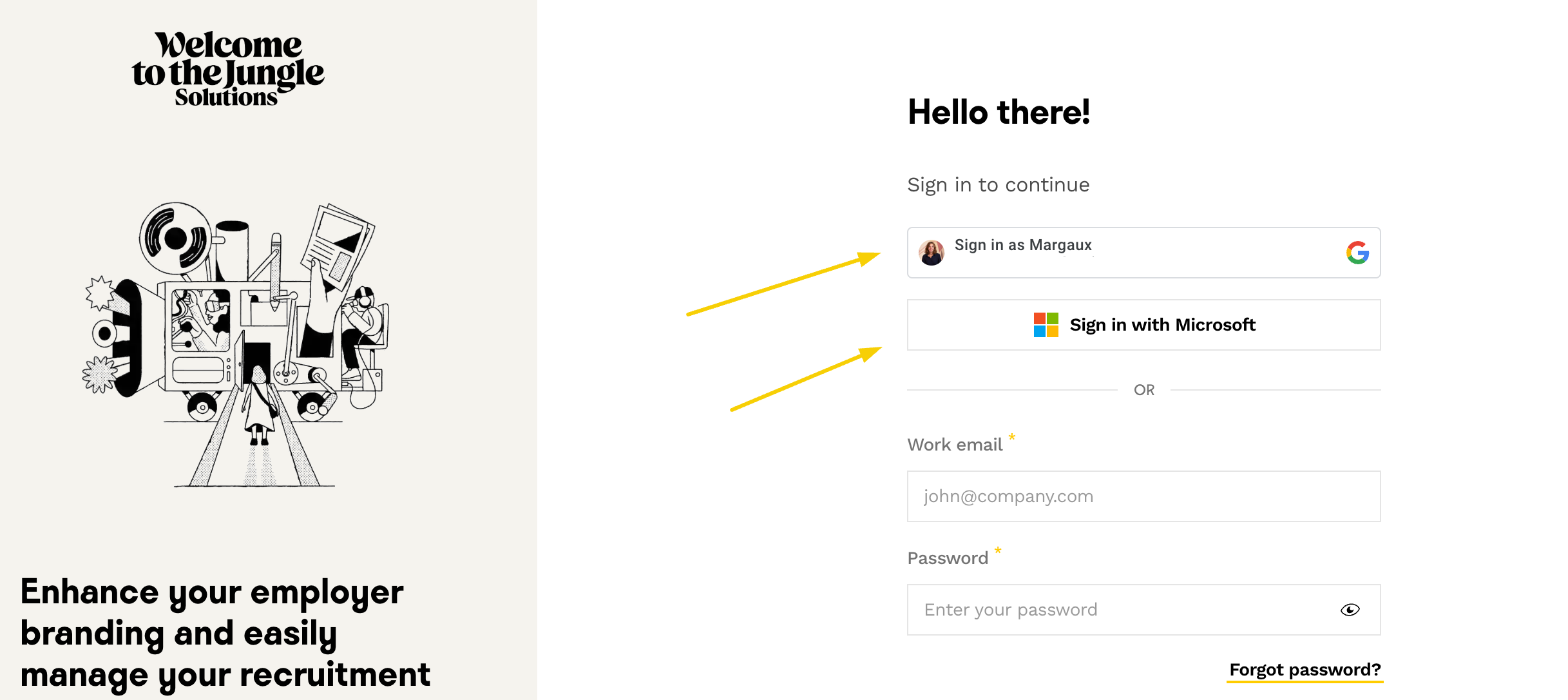 In short, it's a lot of complicated words for something very simple: in simple terms, a Single Sign-On (SSO) allows you, the user, to log in to all Welcome to the Jungle Solutions products at once, with no need to log in separately to Welcome to the Jungle Solutions ATS and all the other products (we've got lots of new stuff coming!).