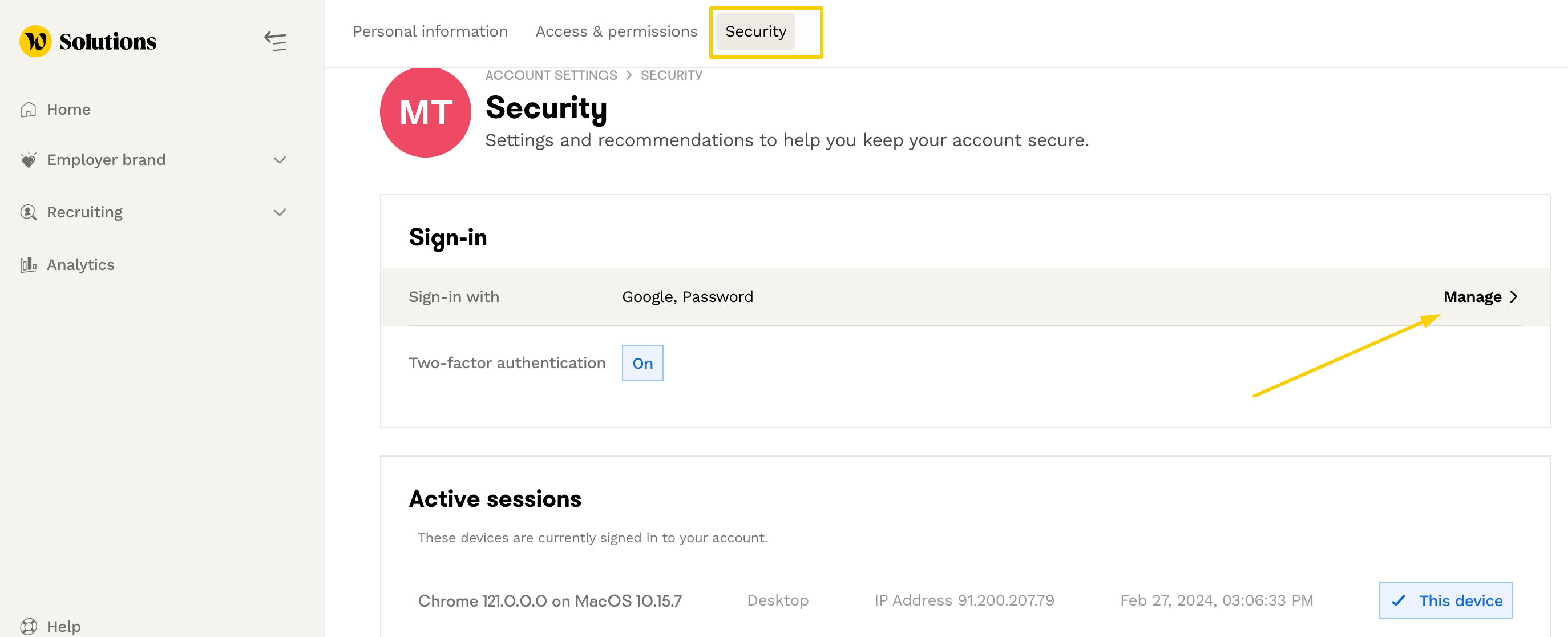 Once on the page, click on the "Security" tab, then "Manage" from the « Sign-in > Sign-in with" panel: