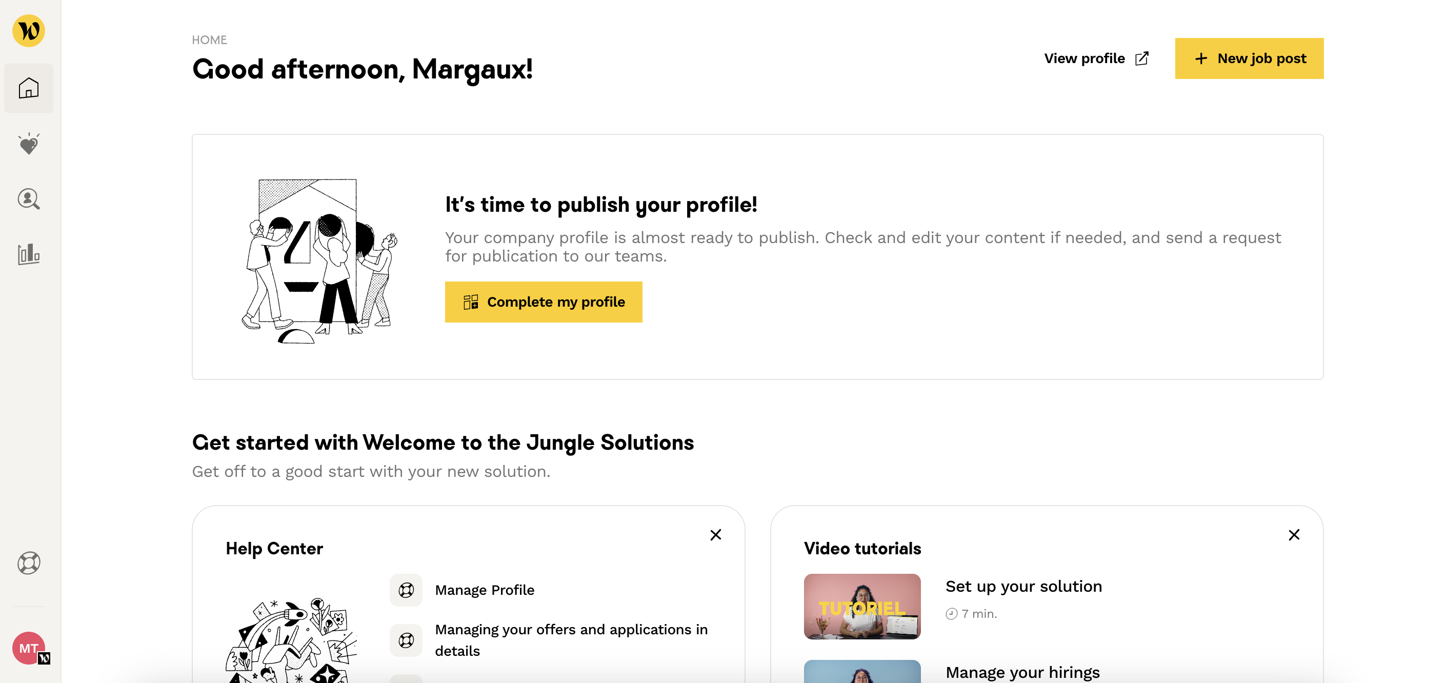 This page gives you access to all the rest of Welcome to the Jungle. This is where everything starts from, and where you will be able to find key information regarding our news, our products, the management of your members (if you have an admin account on the Welcome to the Jungle Solutions ATS), and your personal settings too.