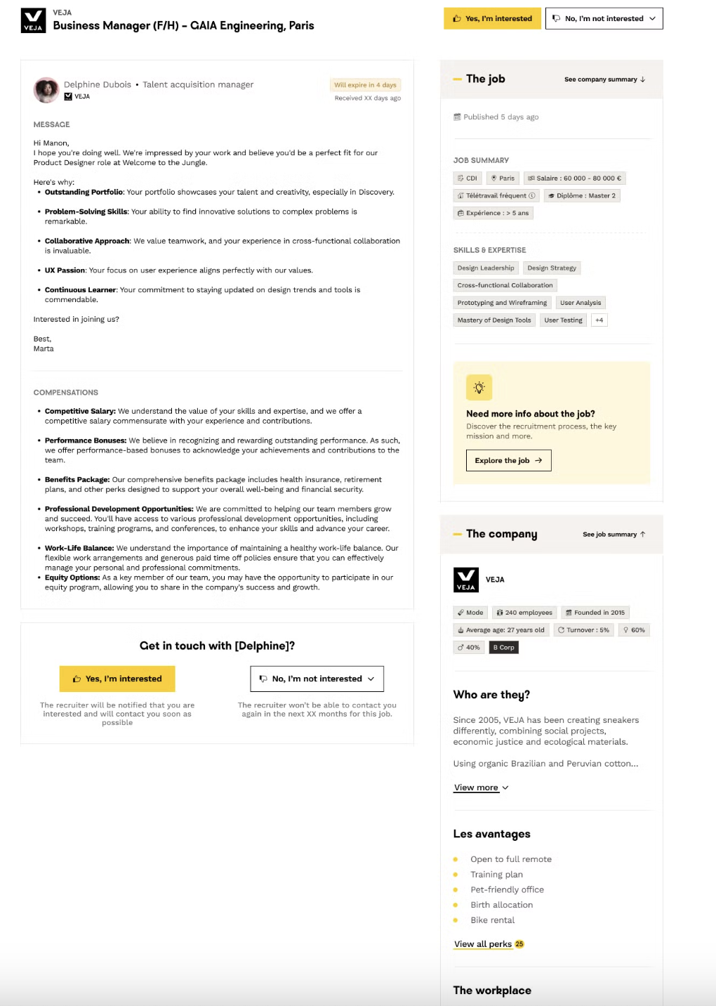 This message serves as your first point of contact with your talent: you will have the opportunity to present the position, explain what caught your attention in the talent's profile, and discuss the compensation and benefits offered by your company.