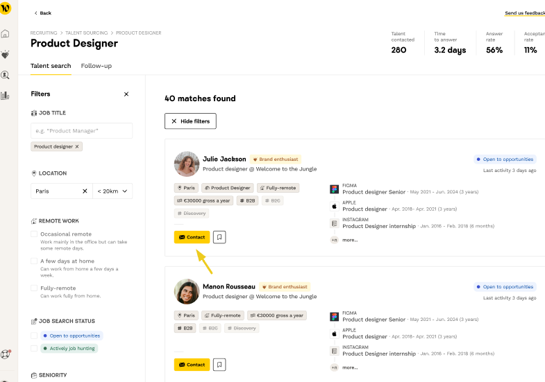 Talents can respond to proposals directly from their Welcome to the Jungle profile, centralizing feedback. Youâll see positive or negative responses updated in your tool automatically.