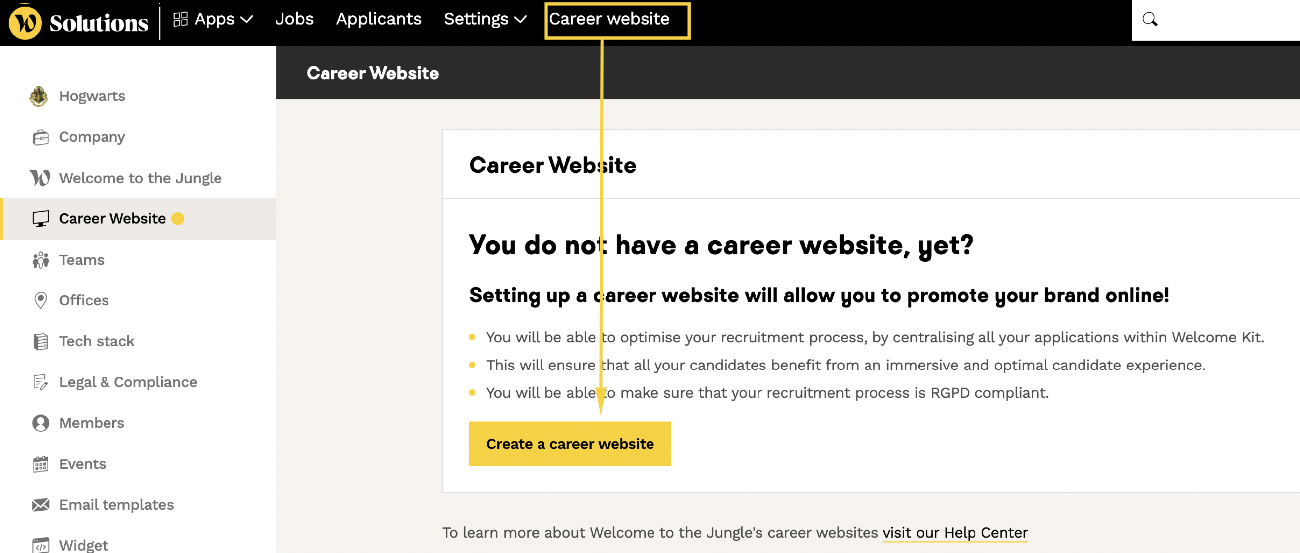 If your organisation has the Starter plan on Welcome to the Jungle, and you have the Admin status in the Welcome to the Jungle Solutions ATS, you can create a classic career website directly from your settings.