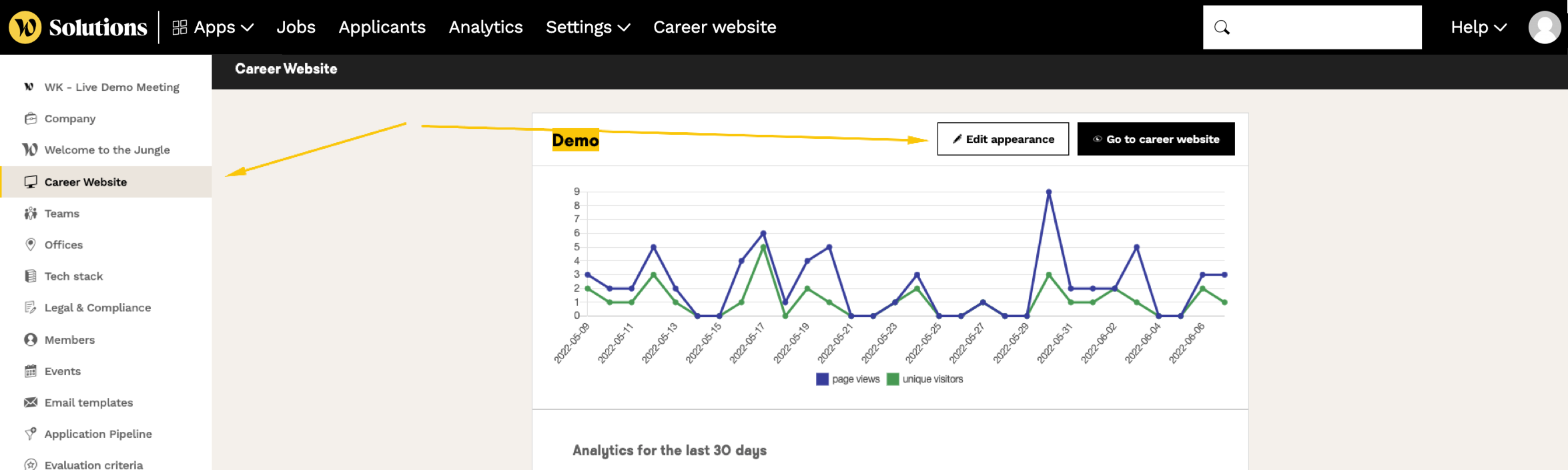 To do this, simply click on "settings" in the top left, then the Career website section, and then the "edit appearance" button.