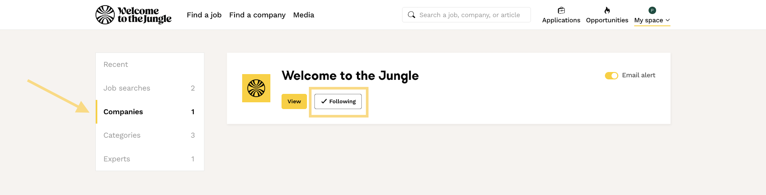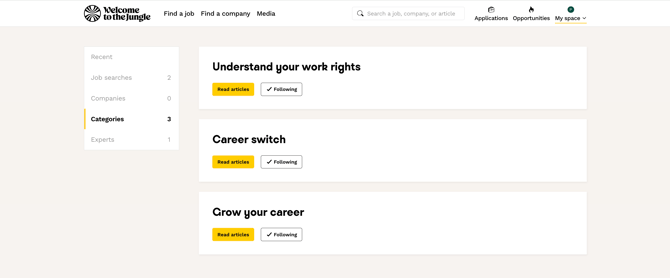 Your Welcome to the Jungle space is filled with customized sections and settings that you can modify on a daily basis: experts lab, saved and favorite jobs, companies, article topics, articles.